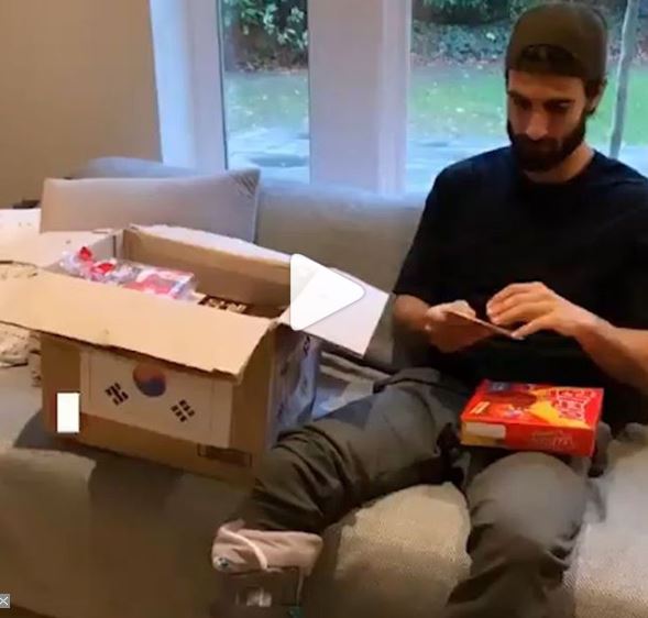 영상에 공개된 상자에는 한국 과자들이 잔뜩 들어있으며, 태극기가 바깥에 붙어있다.