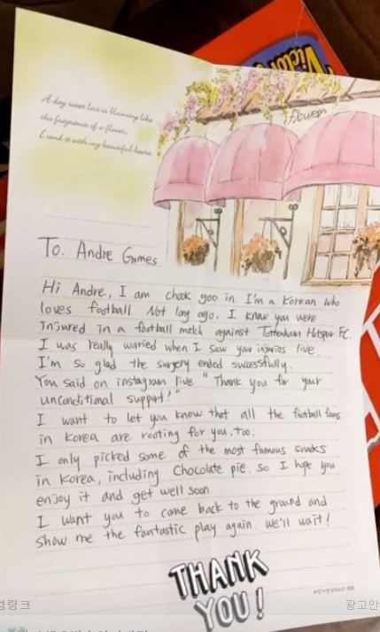 손흥민 선수와 부딪히며 발목이 골절된 안드레 고메스 (26, 에버튼 FC)선수가 한국 팬에게서 감동적인 선물과 편지를 받았다.