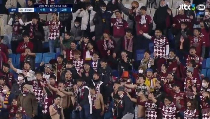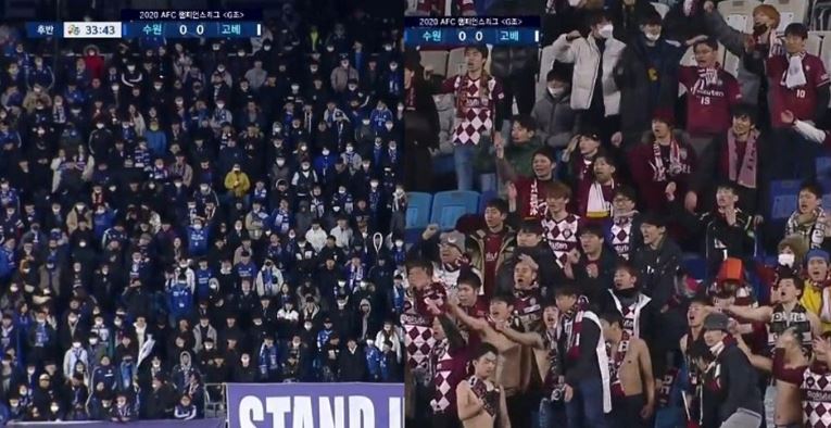 19일 펼쳐진 챔피언스리그 조별리그에서 수원 삼성(한국)이 빗셀 고베(일본)에게 패했다. 하지만 '코로나19' 우려 속 관람에 참여하는 태도 만큼은 한국이 일본을 이겼다.