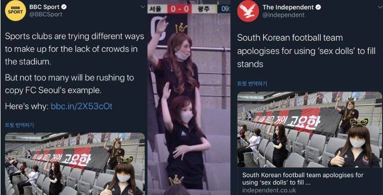 FC서울이 무관중으로 진행된 객석에 '리얼돌'을 앉혔다는 의혹으로 국제적인 망신을 당하고 사과문을 발표했다.