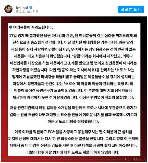 결국 FC서울은 18일 새벽 공식 SNS에 "팬 여러분들께 사과드린다"며 사과문을 게재했다.