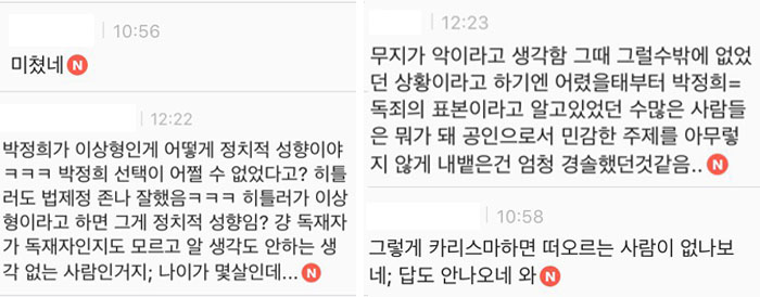 전씨가 정치인 후보에 대한 나름의 판단 없이 아버지의 말을 따라 투표했다는 점에서 네티즌들은 경악하고 있다.