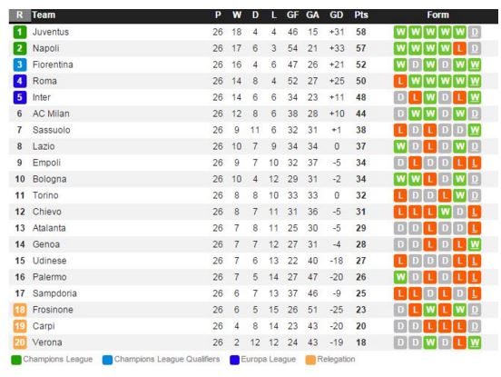 양팀 모두 주중 유로파리그를 치르는 빡빡한 일정 속에 있는 가운데 피오렌티나는 지난 라운드 아탈란타 전에서 3-2 승리를 거두고 리그 3위를 유지하고 있다. 최근 리그 6경기에서 4승 2무를 거두며 무패행진을 거듭하고 있다. 나폴리는 지난 라운드 AC 밀란 전에서 0-0 무승부를 거두고 최근 3경기에서 1무 2패로 다소 주춤하다. 쉬지않고 득점포를 가동하던 이과인의 득점포가 중단되었고 그러면서 팀 공격력도 다소 약해진 모양새이다. 거기에 주중 유로파리그도 반드시 승리를 거두어야 하는 부담감을 안고 있기에 체력적으로 부담이 많이 될 것으로 보인다.