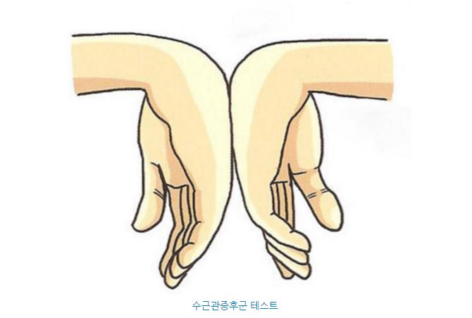수근관증후군 테스트는 양쪽 손목을 꺾은 채로 손등을 마주대고 1분 정도 유지하였을 때 손이 저리거나 통증이 있는지 검사하는 테스트이다.