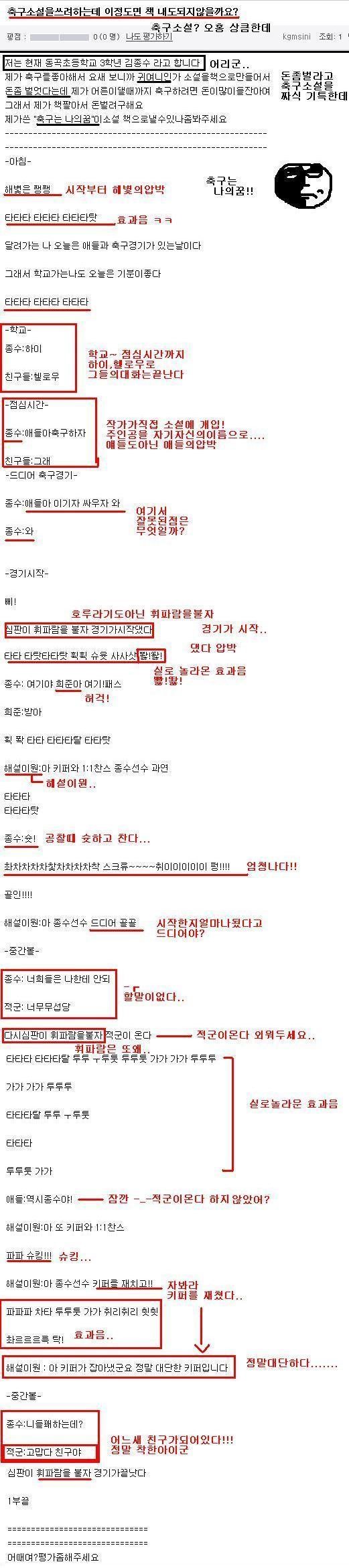 이 글은 동곡초등학교 3학년 김종수라는 학생이 작성한 것으로 "축구를 좋아하는데 어른이 될 때까지 축구하려면 돈이 들테니,귀여니처럼 소설 책으로 돈을 좀 벌고 싶다"며 제작 동기를 밝히고 있다.