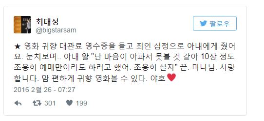 눈치를 보던 최태성에게 아내는 "마음이 아파 못 볼 것 같아서 10장 정도만 조용히 예매하려 했다"면서 짧게 말을 마쳤다.