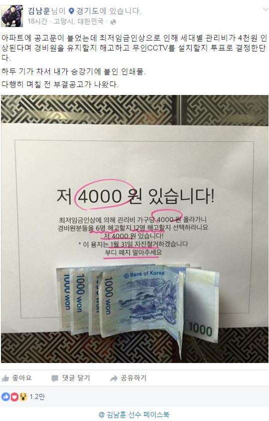 그는 "아파트에 공고문이 붙었는데 최저임금인상으로 인해 세대별 관리비가 4천원 인상된다며 경비원을 유지할지 투표로 결정한단다"며 분노했다.