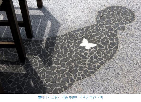 언뜻 그림자로 착각할 수도 있는 소녀상의 뒤편에는 허리가 구부러진 '할머니의 그림자'가 그려져 있다.