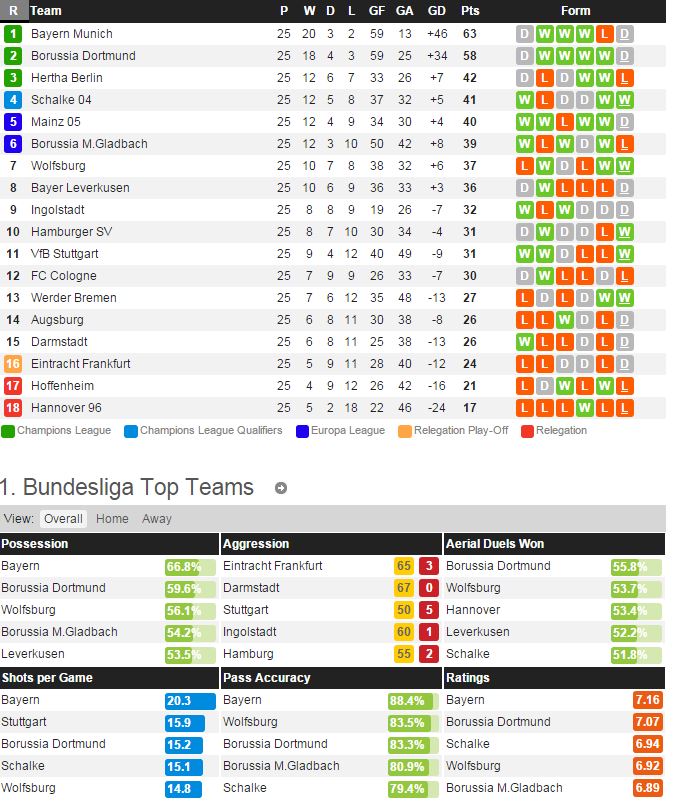 베를린은 지난 라운드 함부르크 전에서 0-2 패배를 당하며 리그 3위를 유지하고 있다. 그러나 베를린은 올시즌 12번의 홈 경기에서 단 1패만 내줄 만큼 인상적인 성적과 경기력을 보여주고 있다. 살케는 지난 라운드 쾰른 전에서 3-1 승리를 거두고 리그 4위로 순위를 끌어올렸다. 최근 훈텔라르와 가이스 등 주전 선수들이 좋은 경기력을 보여주며 팀의 승리를 이끌고 있고 최근 맞대결에서도 5승 1무로 살케가 압도적인 우세에 있다.