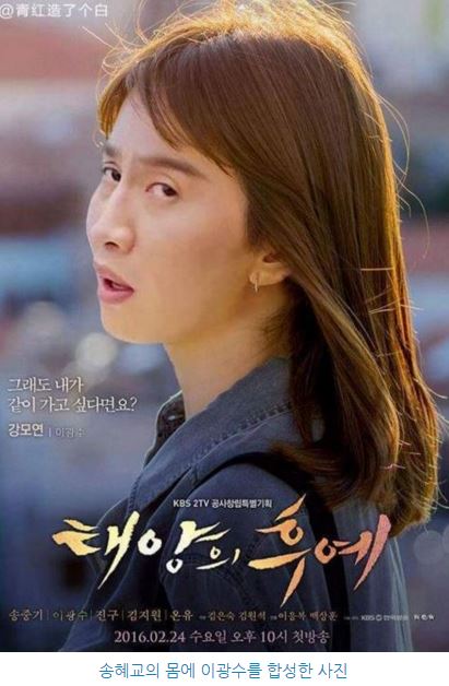 그런데 많은 태양의후예 관련 글 중 특이한 글이 있다. 바로 '송혜교'에 연예인 '이광수'를 합성한 이미지들이다. 도대체 여주인공인 송혜교에게 '이광수'를 합성하는 이유는 무엇일까?