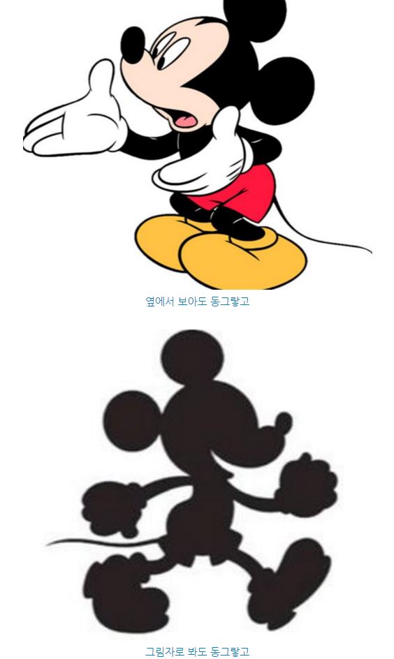 미키마우스의 귀는 어느 방향에서 보든 동그란 모양이다. 측면을 포함한 어느 방향에서 봐도 미키마우스의 귀는 동그란 모양을 하고 있다.