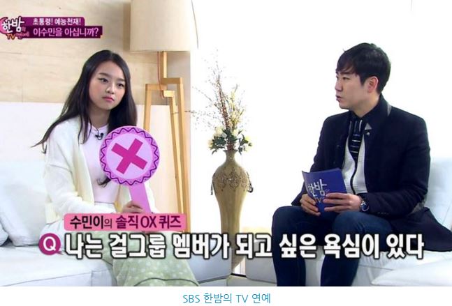 이날 이수민 양은 "걸그룹 멤버가 되고 싶은 욕심이 있냐?"는 질문에 "아니다"라고 답했다.