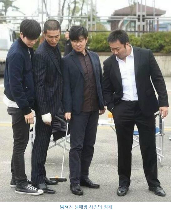 문제의 사진은 4명의 배우가 검은 정장을 입고 아래를 내려다보고 있는 사진이다. 마동석, 김상중, 조동혁, 박해진 4명의 남자 배우와 역광은 범죄영화의 생매장 후 장면이라는 추측을 낳았다.