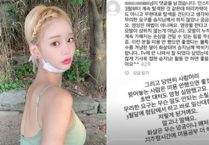 해당 누리꾼은 "SNS를 보니 3월부터 계속 탈색한 것 같은데 머리카락이 좀비도 아니고 무한대로 탈색을 견딘다고 생각하냐"라며 "무리한 요구를 승지님께서 하지 않았나 궁금하다"라고 말했다.