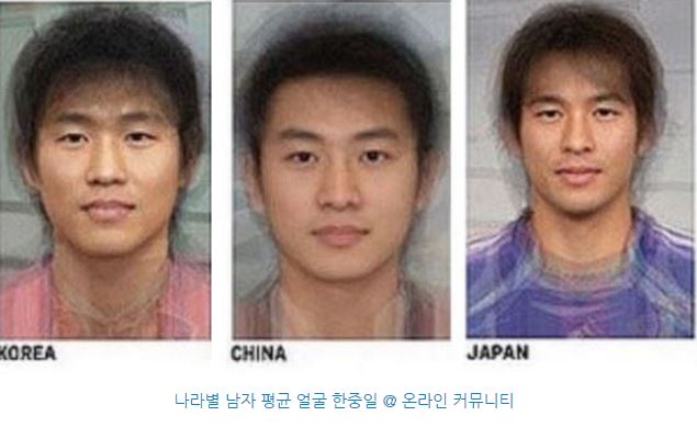 특히 동아시아 한중일 3국의 남자 얼굴 평균의 특징이 뚜렷한 것이 보인다.