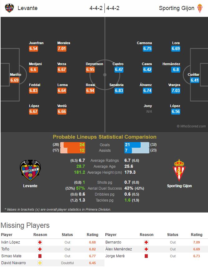 레반테는 데포리티보 원정에서 1-2로 패하며 기운이 한풀 꺾였다. 최근 5경기 성적은 1승1무3패. 승점24로 리그 순위 20위다. 히혼은 4연패를 기록하다 지난 ATM과 홈경기서 2-1로 이기는 이변을 일으켰다. 승점3을 확보하며 리그 순위는 19위. 레반테와는 3점차다. 강등 싸움을 위한 두 팀의 외나무다리 혈투가 예상된다. 레반테는 6골4도움의 키맨 MF 모랄레스가 건재하다. 주포 FW 데이버슨(9골)과 경험 많은 FW 로시가 전방에 포진한다. 히혼은 키맨 MF 베르나르도가 부상으로 빠졌다. FW 사나브리아(11골), FW 카스트로(7골)의 결정력에 기대를 걸고 있다.