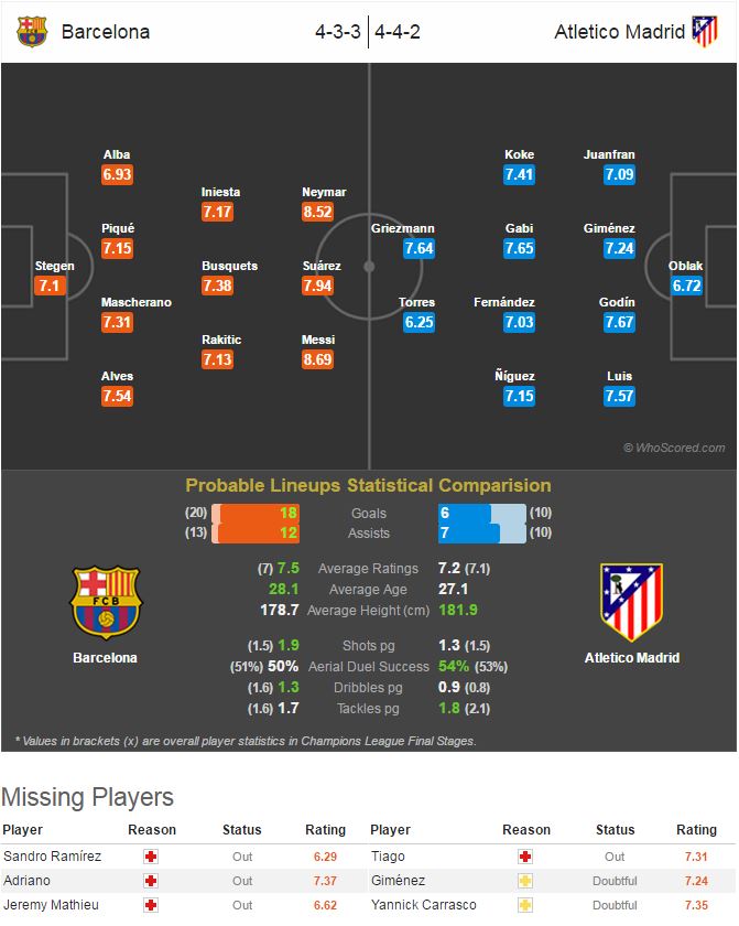 바르셀로나는 지난 주말 엘클라시코 레알마드리드 전에서 1-2 패배를 당하며 무패행진이 마침내 마감 되었다. 패배를 당하기는 했지만 MSN 을 비롯한 주전 대부분 좋은 컨디션을 유지하고 있고 마티유를 제외하고는 큰 부상자도 없기에 스쿼드 운용에 큰 어려움이 없어 보인다. AT 마드리드도 지난 주말 베티스를 5-1 승리를 이끌며 기분 좋게 이번 경기를 임하게 된다. 마드리드도 역시 티아고 정도를 제외하고는 큰 부상자가 없다는게 장점이지만 지난 1월 1-2 패배를 비롯하여 최근 6번의 맞대결에서 단 1번도 승리를 거두지 못했기에 바르셀로나 원정이 부담이 될 것으로 보인다.