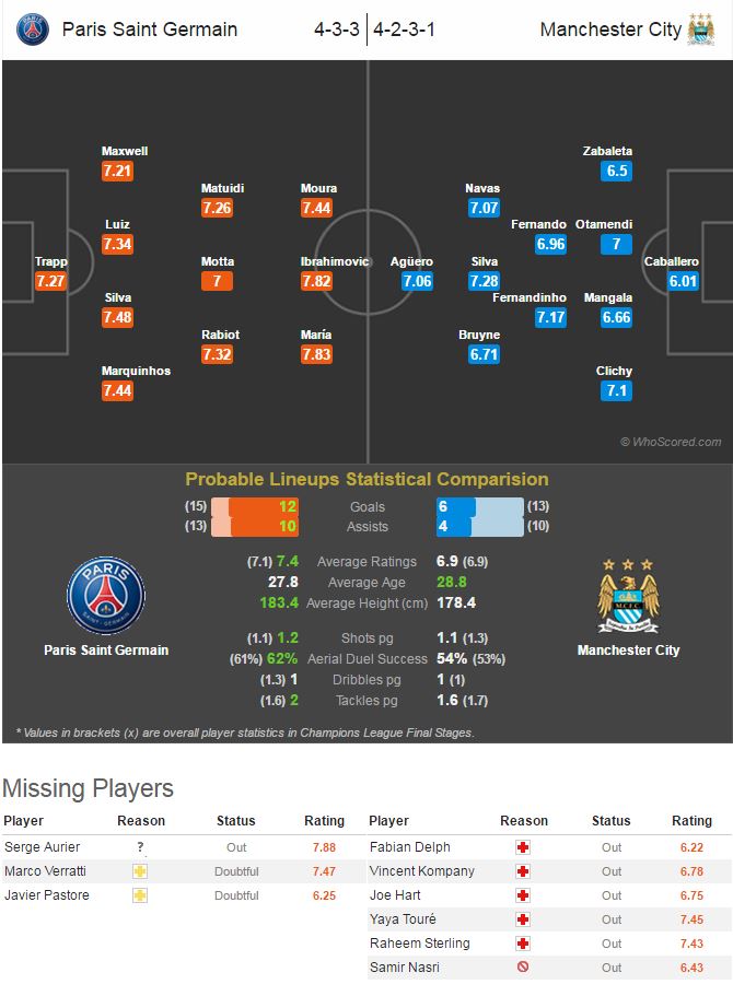 PSG 는 지난 주말 이미 우승을 확정 지었지만 니스에게 4-1 대승을 거두며 좋은 분위기를 만들었다. PSG 는 마튀이디-파스토레-베라티 등 핵심 미드필더 선수들이 부상 중이지만 즐라탄-카바니가 이끄는 공격진의 최근 컨디션은 날카로움을 보여주고 있다. 맨시티는 지난 주말 본머스전에서 4-0 대승을 거두었다. 맨시티도 주장 콤파니를 비롯하여 투레-페르난도-조 하트 등 주전 선수들이 부상자 명단에 올라있다. 객관적인 전력차는 양팀 모두 크게 나지 않지만 PSG 의 홈 경기임을 감안하면 맨시티에게 쉽지 않은 원정 경기가 예상된다.