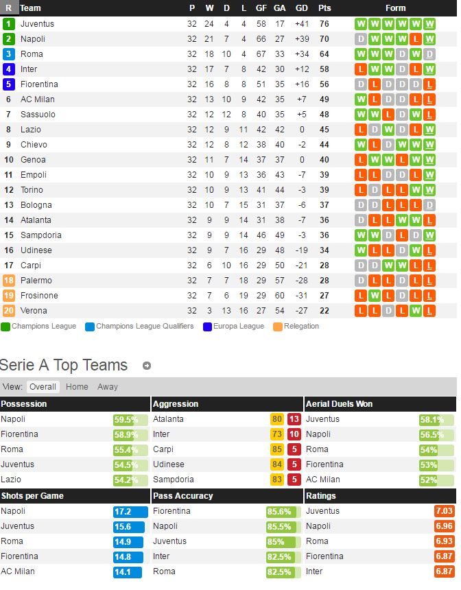 아탈란타는 지난 라운드 토리노 전에서 1-2 패배를 당하며 리그 2연승 행진이 중단 되었다. 수비수 드라메가 중심을 잡으며 버티고 있지만 로마의 공격진을 감당하기엔 쉽지 않아 보인다. 로마는 지난 라운드 볼로냐 전에서 홈에서 의외로 고전하며 1-1 무승부를 거두고 리그 3위를 유지하고 있다. 공격수 살라가 좋은 모습을 보여주며 오랜만에 리그에서 득점에 성공 한것이 유일한 위안거리이다.