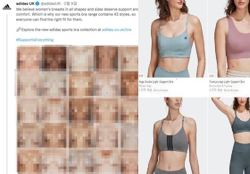 영국 아디다스는 지난 9일 공식 트위터에 '#SupportisEverything'이라는 해시태그와 함께 새로운 스포츠 브라 제품군을 소개하는 홈페이지 링크를 올렸다.