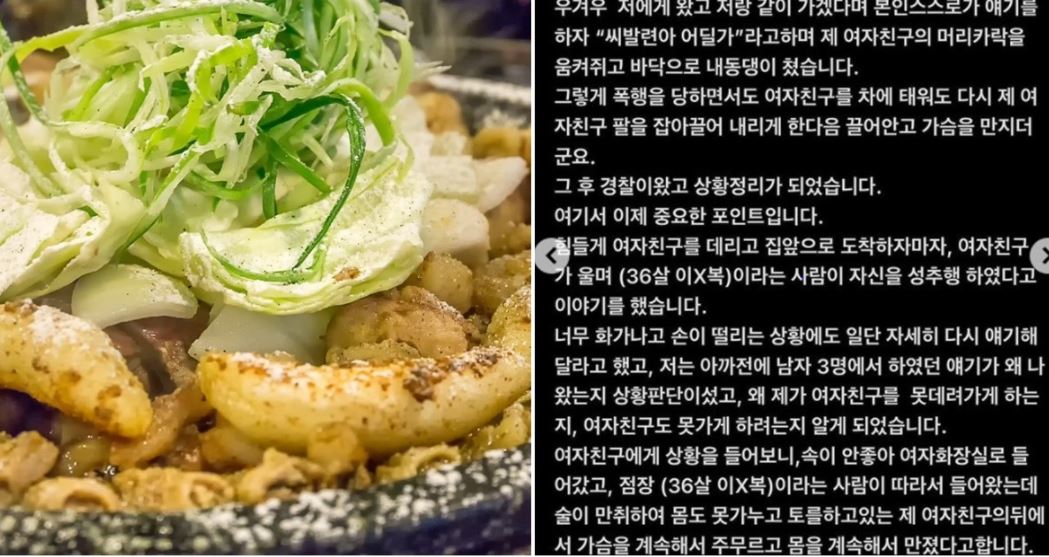 글에 따르면, 이날 해당 가게에서 첫 근무를 시작한 A씨의 여자친구는 영업 종료 이후 열린 회식 자리에 참석했다. 여자친구가 다음날 오전 1시가 넘도록 연락이 닿질 않자 걱정된 A씨는 식당을 찾아갔다.