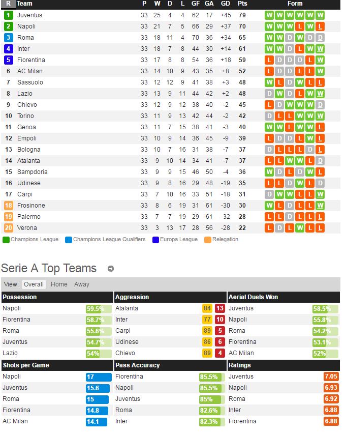 팔레르모는 지난 라운드 유벤투스 전에서도 0-4 완패를 당하고 리그 19위 강등권으로 추락하였다. 잦은 감독 교체로 인한 전술의 통일성도 없어졌고 최근 리그 5경기에서 단 1득점도 올리지 못할 정도로 공격진에 부진이 길어지고있다. 아탈란타는 지난 라운드 로마 전에서 3-3 아쉬운 무승부를 기록했다. 아탈란타는 최근 팔레르모가 리그 12경기 연속 승리를 기록하지 못하고 있기에 승리를 올릴 수 있는 좋은 기회가 될 것이다.