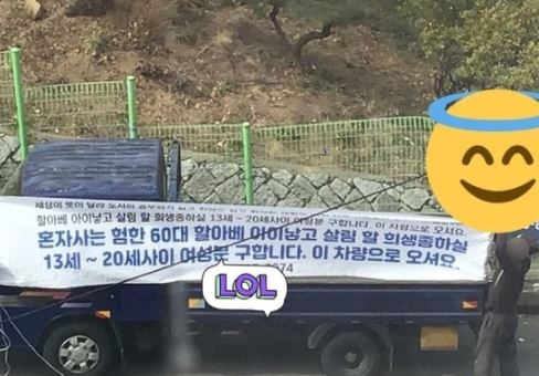 이어 파란색 큰 글씨로 "혼자 사는 험한 60대 할아버지의 아이를 낳고 살림할 희생종 하실 13~20세 사이 여성분 구한다"는 내용이 현수막을 가득 채웠다.