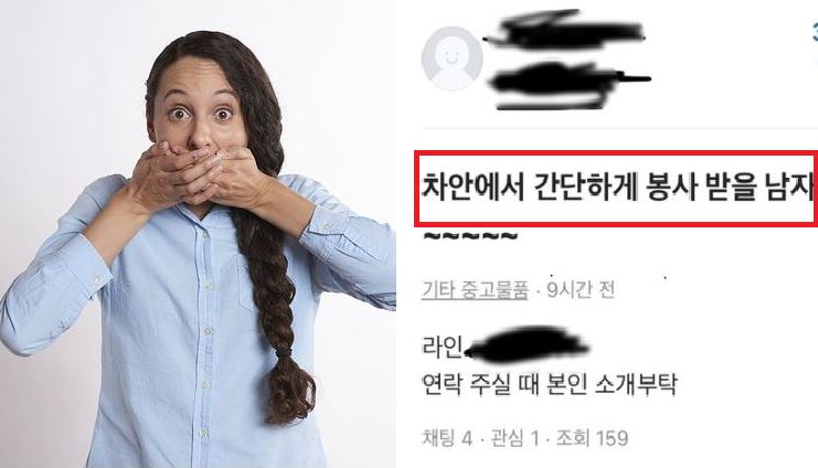 당시 이 게시물은 '기타 중고 물품' 품목에 올라온 것으로, 판매자는 "차 안에서 간단하게 봉사 받을 남자분만 (구한다). 연락하실 때 본인 소개 부탁"이라며 메신저 앱 아이디를 함께 남겼다. 심지어 판매 가격은 '나눔'이라며 무료임을 암시했다.