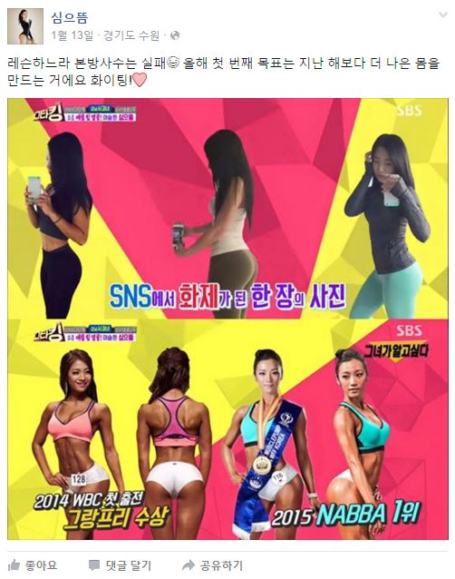 일요일 오전마다 KBS 예능프로그램 '츌발 드림팀'에 출연하는 그녀. 바로 진정한 '애플힙'의 주인공 심으뜸입니다. 일요일 오전이라 다소 민망하기도 하지만 그래도 못내 아쉬웠던(?) 남성 팬분들이 여럿 있을 줄 압니다. 그래서 작정하고 털어봤습니다. 심으뜸의 SNS를.