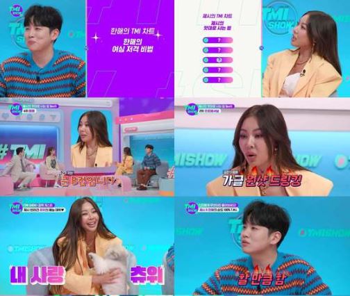 'TMI SHOW'에서 제시와 한해가 화끈한 입담으로 시청자들을 사로잡았다. 제시는 필러와 가슴 사이즈, 연애 등에 대해 솔직하게 털어놨고, 한해는 미주와 핑크빛 기류를 형성했다.