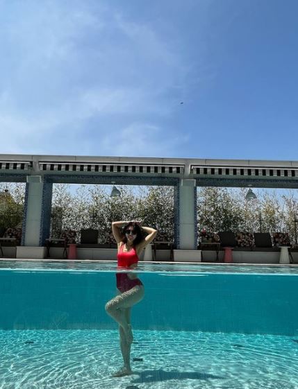 안선영은 11일 자신의 인스타그램에 빨간색 수영복을 입은 전신 사진을 게재했다.