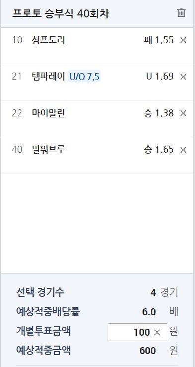 탬파베이 vs 디트로이트 1.37-2.46 일 때 MLB 기준으로 21승 9패// 프로토 기준 언더 기대 확률 52.07% - 적중