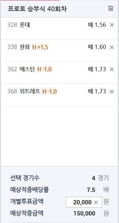 한화 vs 삼성 2.43-1.38 일 때 KBO 기준으로 1승 3패// 프로토 기준 -1.5핸패 기대 확률 55% - 적중
