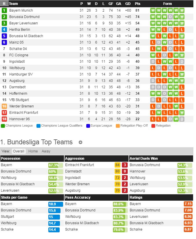 뮌헨은 지난 라운드 베를린 전에서 2-0 승리를 거두고 리그 연승 행진을 거듭하고 있다. 이미 리그 우승은 거의 확실시 되는 상황이고 이 경기 앞뒤로 중요한 AT 마드리드와의 챔스 경기가 있기에 비달-코스타 등 체력부담이 많은 선수들에게 로테이션을 적용 할 가능성이 높다. 뮌헨 글라드 바흐는 지난 라운드 호펜하임에게 3-1 승리를 거두며 리그 5위에 올라있다. 뮌헨글라드바흐는 사카-하파엘 같은 주전 선수들의 컨디션이 최근 좋은 상황이지만 쉽지 않은 뮌헨 원정 길이 될 것이다.