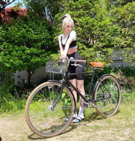 공개된 사진 속 전소미는 크롭탑에 짧은 레깅스 바지를 입고 자전거 앞에 서서 묘한 표정을 짓고 있다.