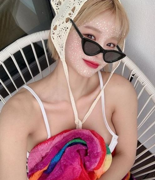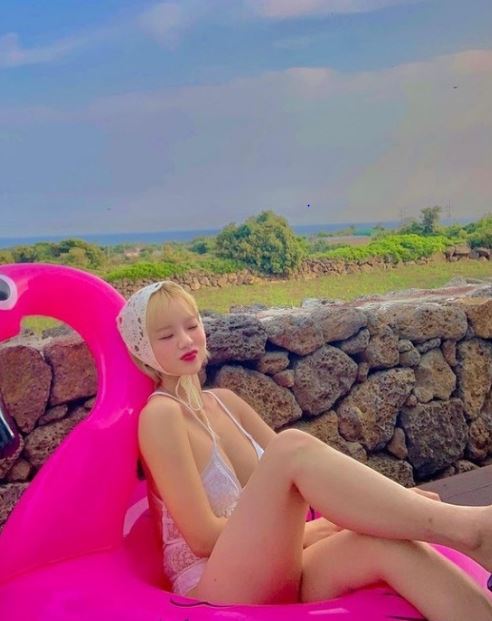 사진 속 맹승지는 흰색 비키니 수영복을 입고 대형 튜브에 올라탄 채 여유를 즐기고 있는 모습이다. 주위로는 제주도 돌담과 바다가 담겨 한적한 분위기도 선사했다.