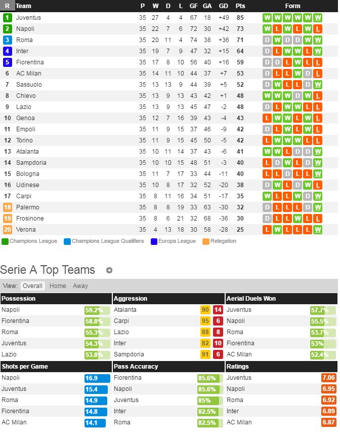 유벤투스는 지난 라운드 피오렌티나 전에서 2-1 승리를 거두면서 리그 우승을 확정 짓는 기쁨을 만끽했다. 마르키시오 등 부상자가 있지만 전력의 큰 차이는 없는 모습이다. 카르피는 지난 라운드 엠폴리 전에서 1-0 승리를 거두면서 리그 17위로 강등권 팀과의 승점차를 3점으로 벌려놓았다. 최근 선수들의 동기부여 및 투혼이 돋보이지만 유벤투스가 최근 홈 14경기에서 전부 승리를 기록하고 있기에 쉽지 않을 것으로 예상된다.