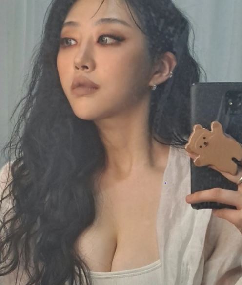 시스루(비침옷) 블라우스를 걸치고 있는 자신의 볼륨감 넘치는 모습을 자신감있게 드러내며 당당하게 자신의 모습을 사진으로 남기고 있다.
