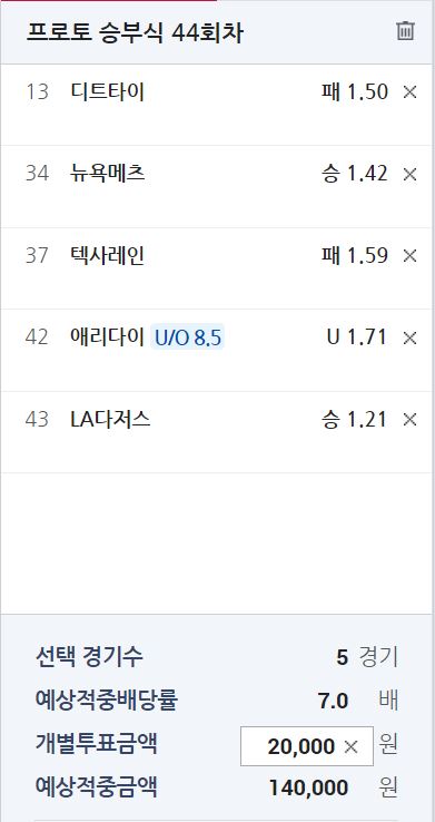 디트로이트 vs 미네소타 2.13-1.50 일 때 MLB 기준으로 23승 36패// 프로토 기준 미네소타 승리 기대 확률 58.67% - 적중 실패