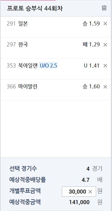 일본 vs 파라과이 1.59-3.35-4.80 일 때 기록 없음// 프로토 기준 일본 승리 기대 확률 55.35%
