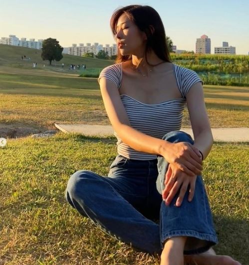 해 질 녘 햇살을 즐기고 있는 서동주는 잔디밭에 앉아 여유롭고 자유로운 시간을 보내고 있는 모습이다.