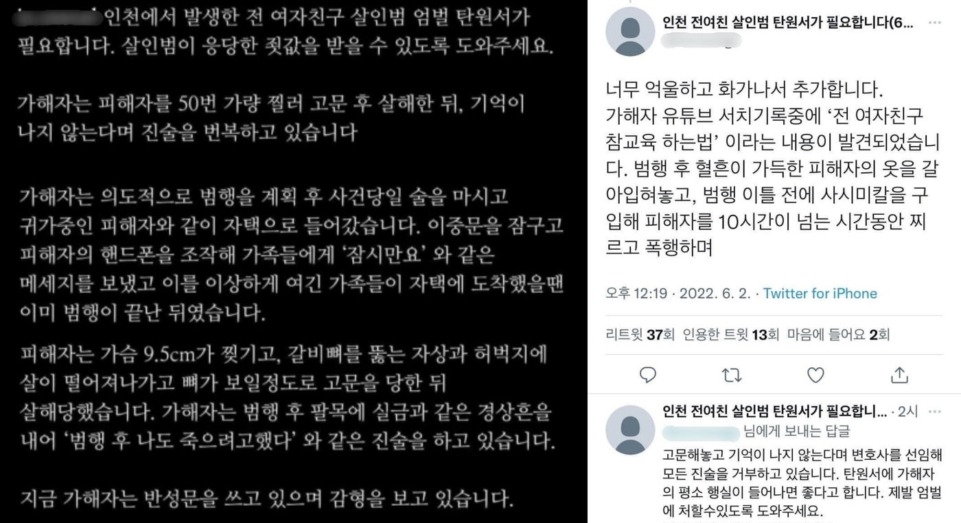 지난 2일 각종 온라인 커뮤니티와 SNS에는 A씨(23)에게 살해당한 전 여자친구 B씨(21) 측 가족이 탄원서를 모으고 있다는 글이 퍼졌다.