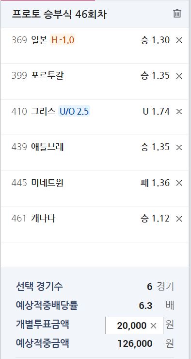 포르투갈 vs 체코 1.35-4.00-6.90 일 때 3승 0무 0패// 프로토 기준 포르투갈 승리 기대 확률 65.19% - 적중