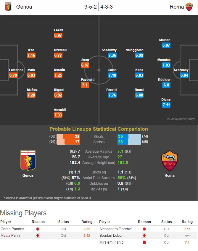 제노아는 지난 주말 볼로냐 원정에서 0-2로 패했다. 최근 6경기서 3승3패. 홈에선 괜찮으나 원정 성적은 썩 좋지 않다. 리그 순위 12위. 팀내 최다득점자 FW 파보레티(11골)을 비롯해 찬스메이킹 능력이 있는 MF 안살디, 링컨 등이 모두 정상 출장한다. 로마는 올시즌 가장 역동적인 시즌을 보내고 있는 MF 프야니치가 징계로 결장한다. 케이타가 그의 공백을 대체할 것으로 관측된다. 지난 주말 나폴리와 빅매치에서 1-0으로 승리했다. 2연승 중이며 최근 6경기서 3승3무로 패배가 없다.