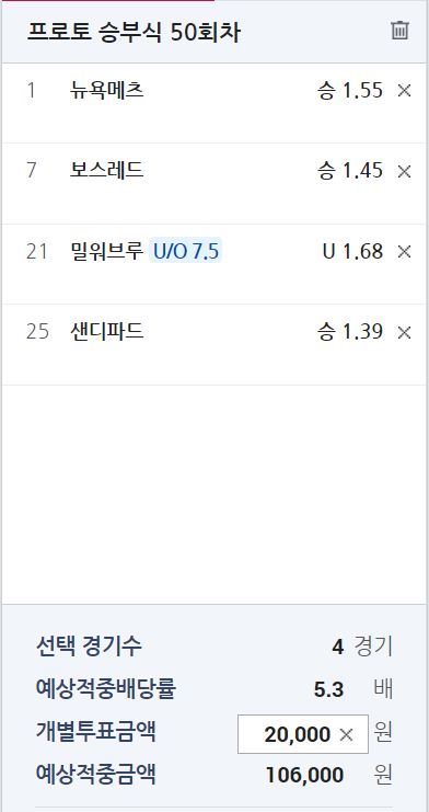 밀워키 vs 세인트루이스 1.53-2.13 일 때 1승 2패// 프로토 기준 언더 기대 확률 52.38% - 적중