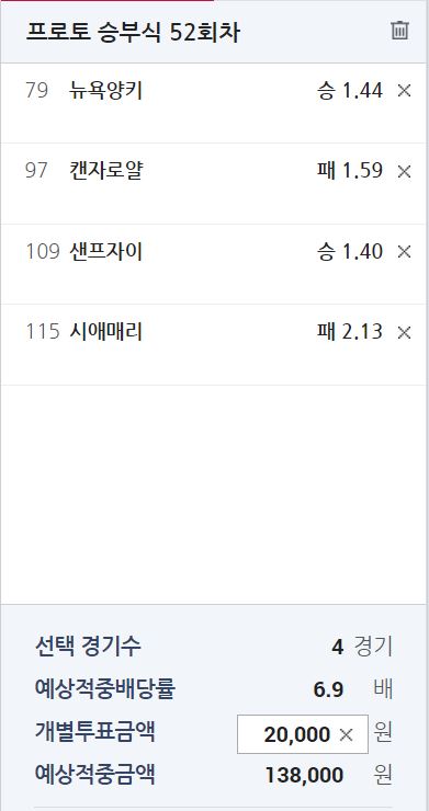 샌프란시스코 vs 디트로이트 1.40-2.44 일 때 5승 2패// 프로토 기준 샌프란시스코 승리 기대 확률 63.57%