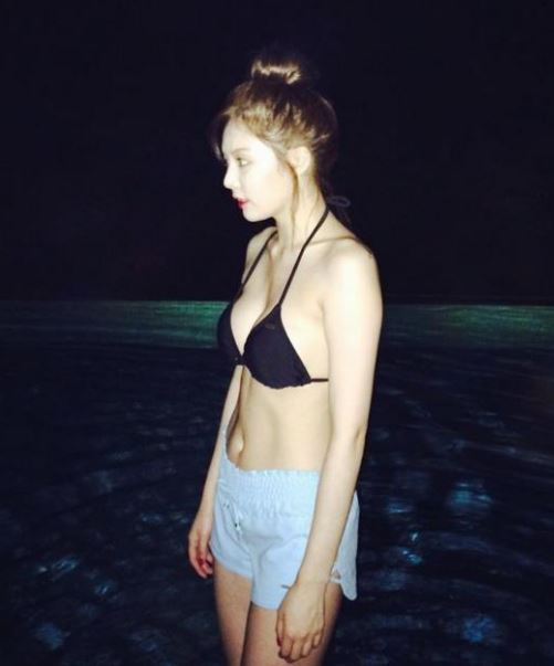 사진 속 현아는 늦은 밤 어두운 수영장에서 검은색 비키니와 하늘색 팬츠를 입고 군살 없는 몸매를 뽐내며 여유로운 휴가를 즐기고 있다.