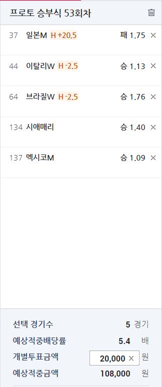 이탈리아 vs 한국 1.13-4.19 일 때 4승 0패// 프로토 기준 -2.5핸승 기대 확률 78.76%