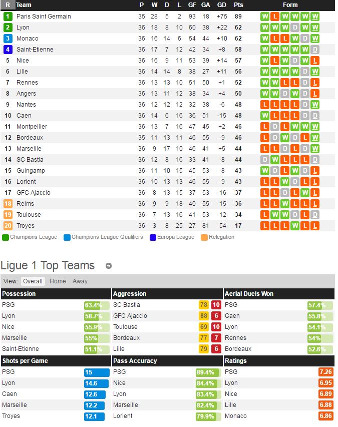 리옹은 지난 주말 아작시오와 홈 경기에서 2-1 승리를 기록했다. 최근 9경기에서 무패 행진을 이어가고 있는 리옹은 후반기 이후 라카제트를 앞세우며 공격력이 더욱 좋아지고 있다. 모나코는 지난 주말 갱강과 홈 경기에서 3-2로 이겼다.모나코는 아쉽게도 원정 경기에서 최근 조금 부진한 모습이다. 최근 맞대결에서는 3승 2무 1패로 모나코가 앞선다. 현재 승점 62로 2위와 3위에 있는 리옹과 모나코는 이 경기 결과에 따라 챔피언스리그, 유로파리그 행이 확정되기에 치열한 경기가 예상된다.