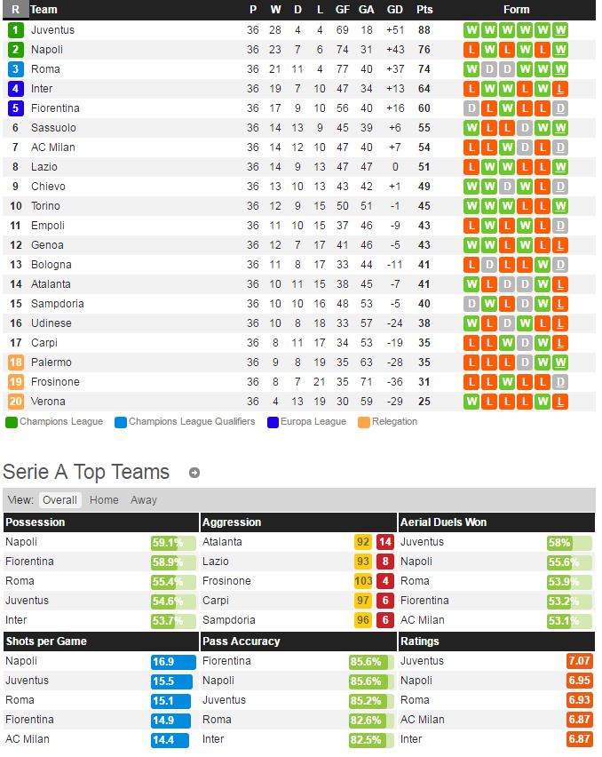 베로나는 이미 강등이 확정 된 가운데 지난 라운드 사수올로 전에서 0-1 패배를 당했다. 베로나에게는 올 시즌 마지막 홈경기 이라는 점을 제외하면 큰 동기부여가 없을 경기가 될 것이다. 유벤투스도 지난 라운드 카르피 전에서 2-0 승리를 거두고 리그 10연승을 이어가고 있다. 유벤투스도 역시 이미 우승을 확정 지은 가운데 지난 경기에서 자자-에르나네스가 득점에 성공하며 승리를 이끌었다. 팀의 여전히 부상자가 많지만 포그바-모라타 등이 이끄는 유벤투스가 패배 하리라는 예상을 하기는 어렵다.
